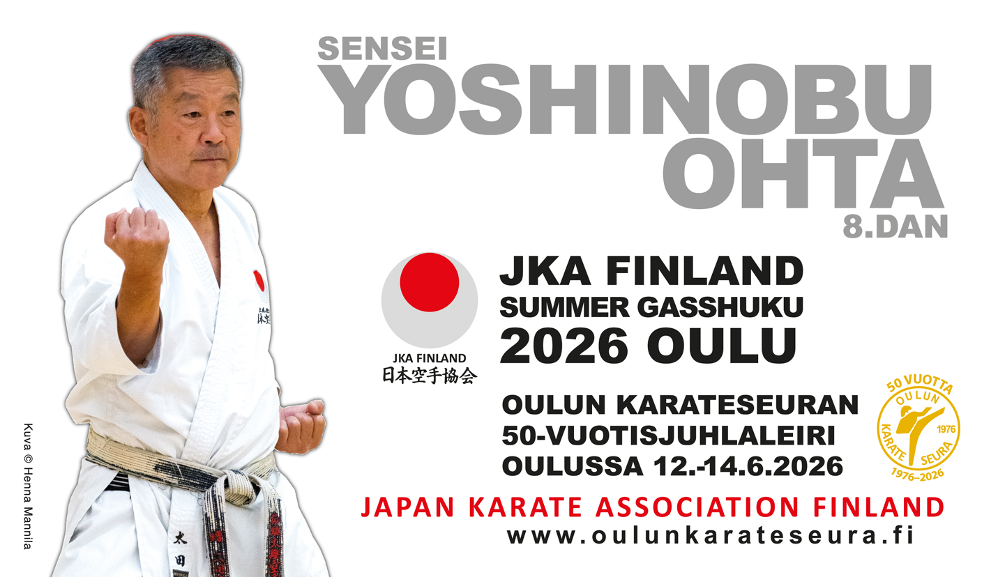 JKA Finland Summer Gasshuku 2026, joka on samalla Oulun Karateseuran 50-vuotisjuhlaleiri, pidetään Oulussa 12.–14.6. Leirin vetäjäksi saapuu JKA Englannin päävalmentaja Yoshinobu Ohta Sensei 8. Dan. Hän on erittäin taitava, kokenut ja maailmanlaajuisesti kysytty leirien vetäjä ja nyt ensimmäistä kertaa vierailemassa Oulussa. Luvassa on tarkkaa opetusta, monipuolisia harjoituksia ja kovaa treeniä.